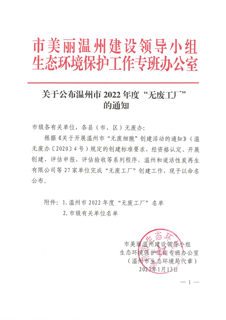 Notice on Announcing the 2022 "Waste free Factory" in Wenzhou City